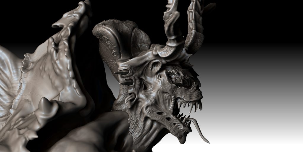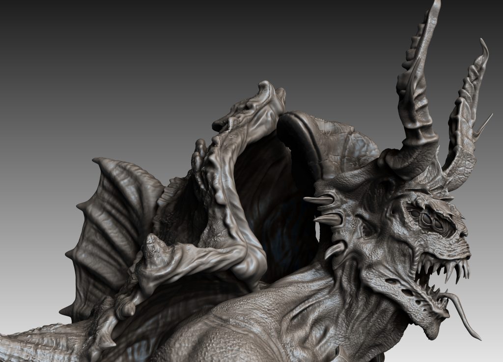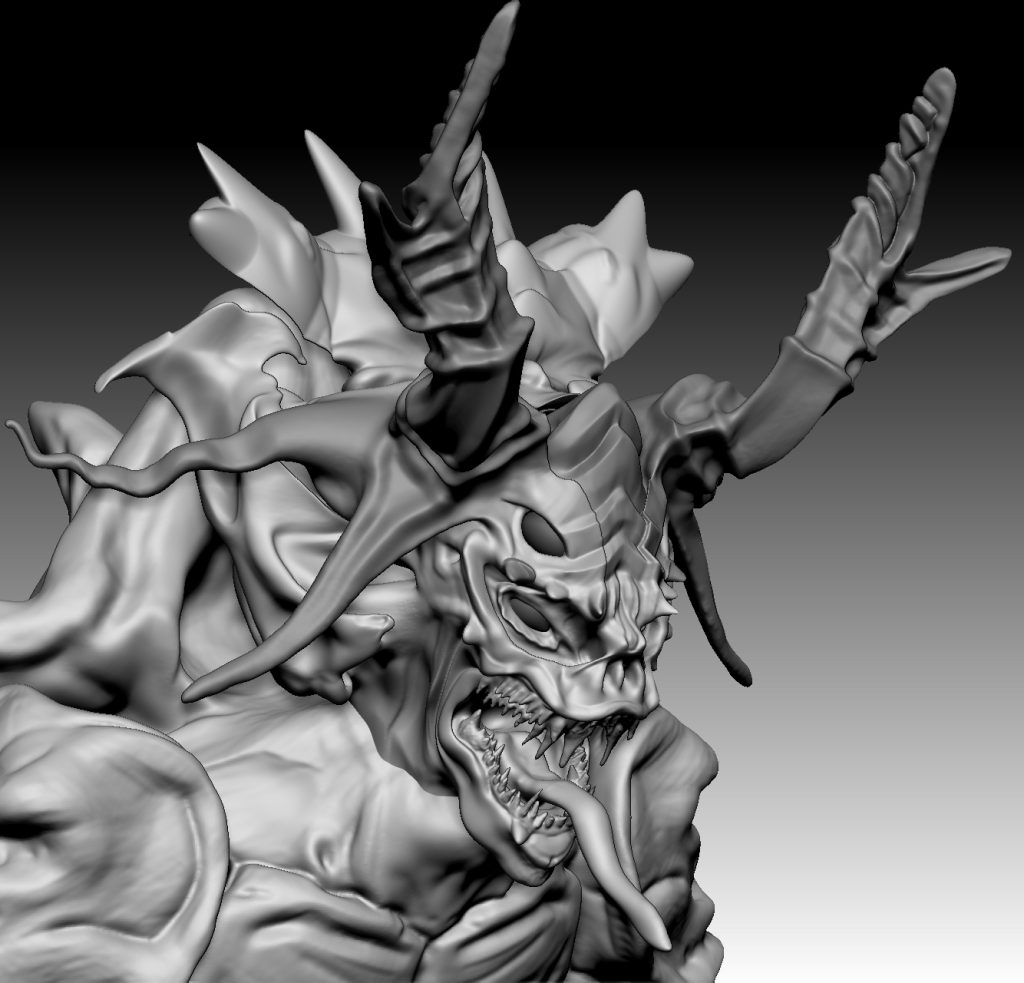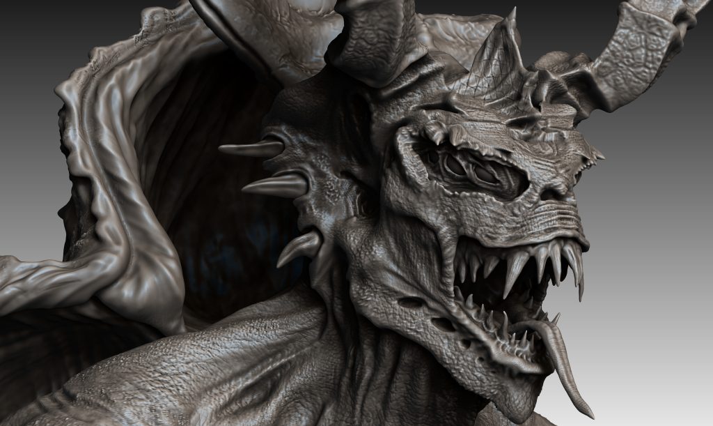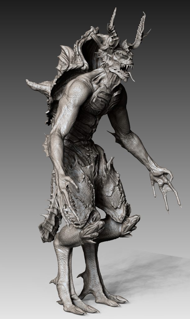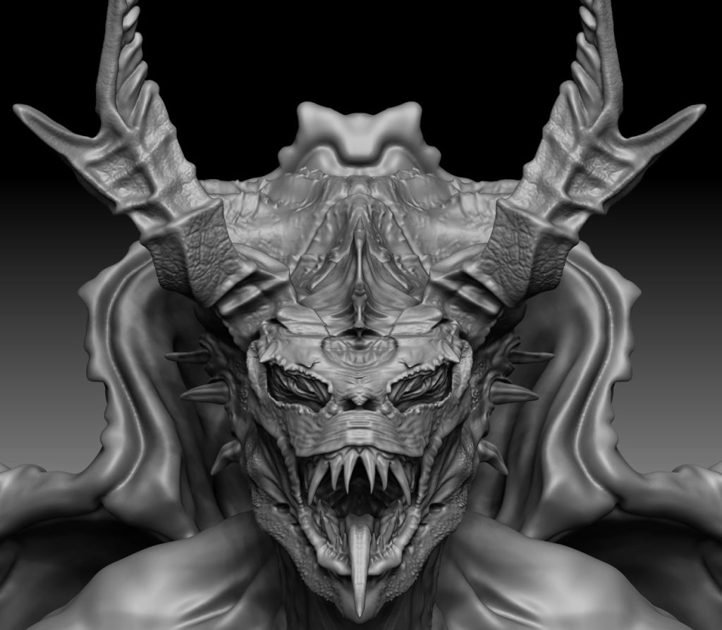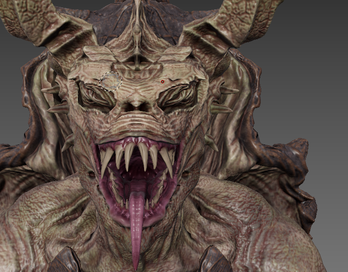 Once the model was somewhat complete, I began the first detail pass. This is the stage where once all the shapes and details are in place, you begin adding the finer details such as refining muscles and tendons, building up the spikes, adding more detail to mouth and teeth. This first pass starts to add more realism to the model (if thats what you want.)