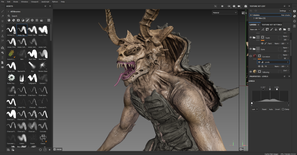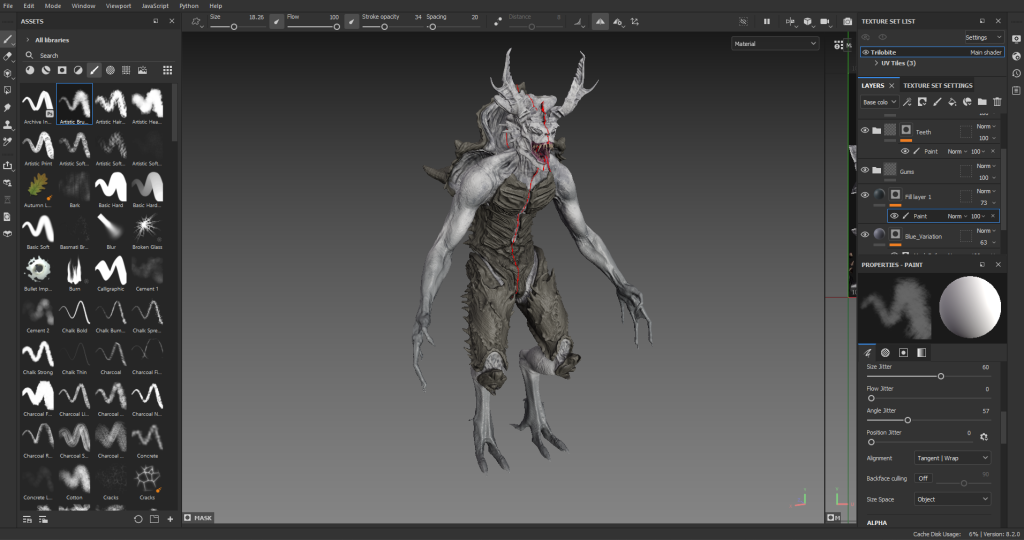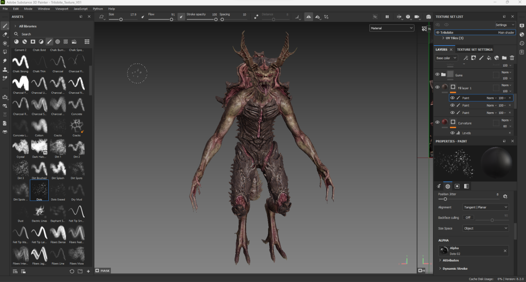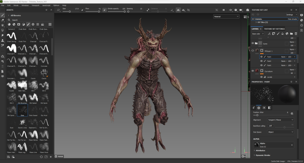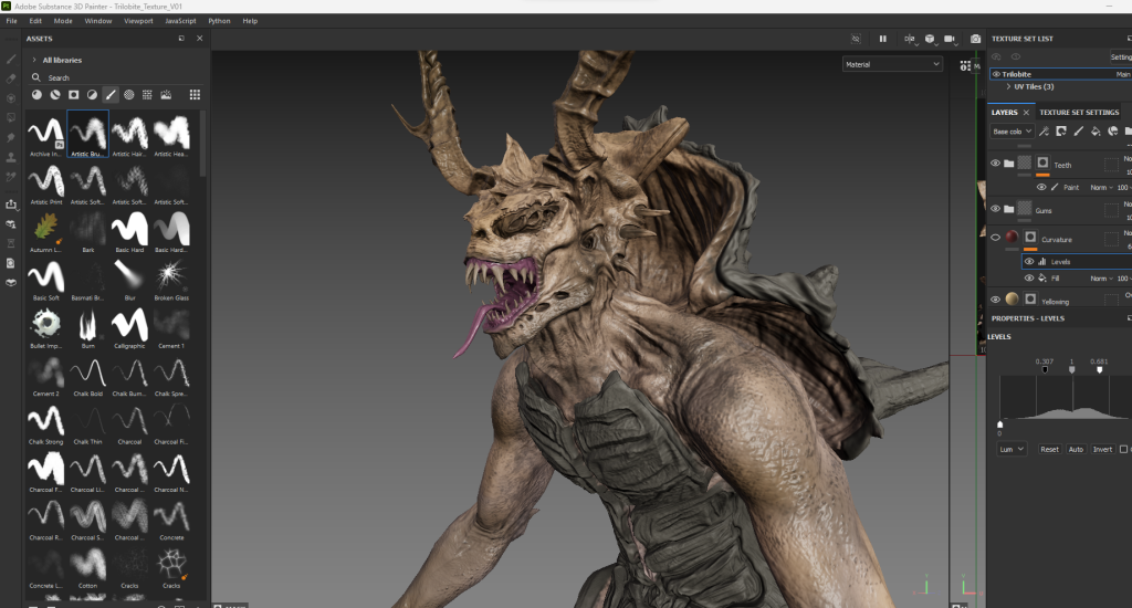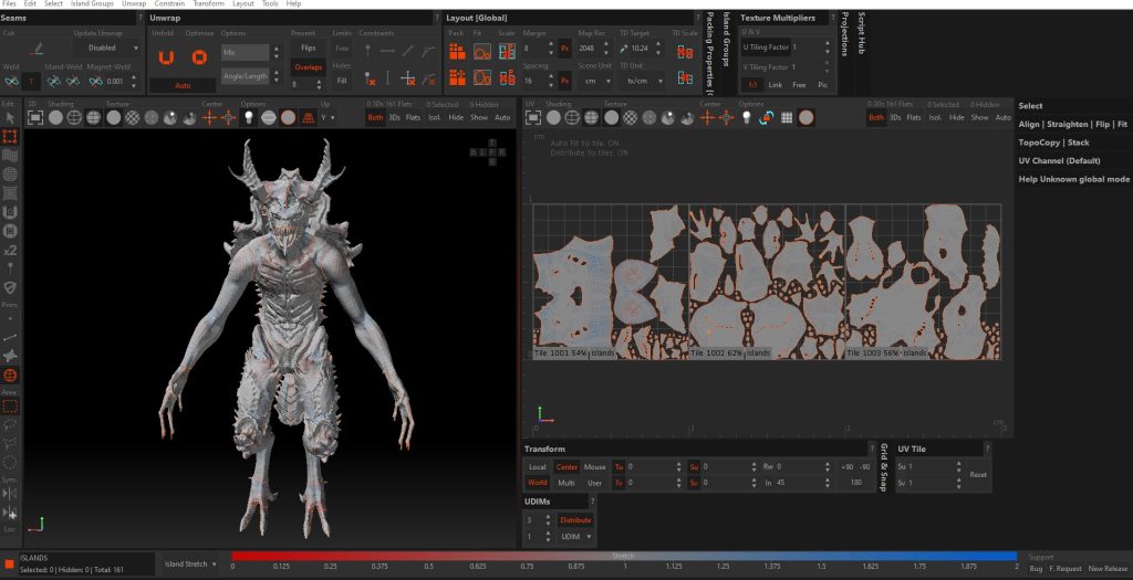 Again I began by breaking up the areas. Uv’ing each part individually and breaking them away one by one. I started with the spikes, teeth and horns, ringing these and splitting them down the back. Once these where done, I began with the head, leaving the mouth. I then broke off the arms and hands, splitting the hands down the center edge and splitting away the elbow fins. Next, I broke away the shell from the back, spltting this down the centre and following suit with the torso. The legs where then broke away at the hip joints and split at the calf, the calf was then split from the foot at the ankle. These where then unwrapped individually and split down the inside. The tongue was then broke away from the mouth and the mouth unwrapped leaving the model now complete. I packed the Uv’s into 3 UDIM’s to preserve some resoloution, saved them and exported them into substance painter to begin the texturing process and finalise the project.