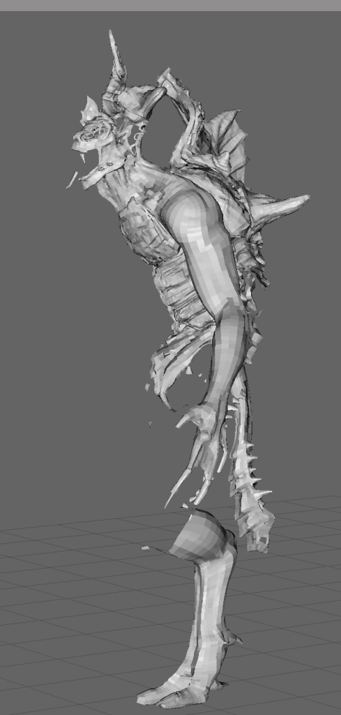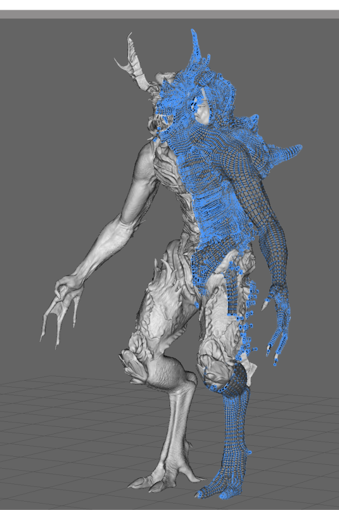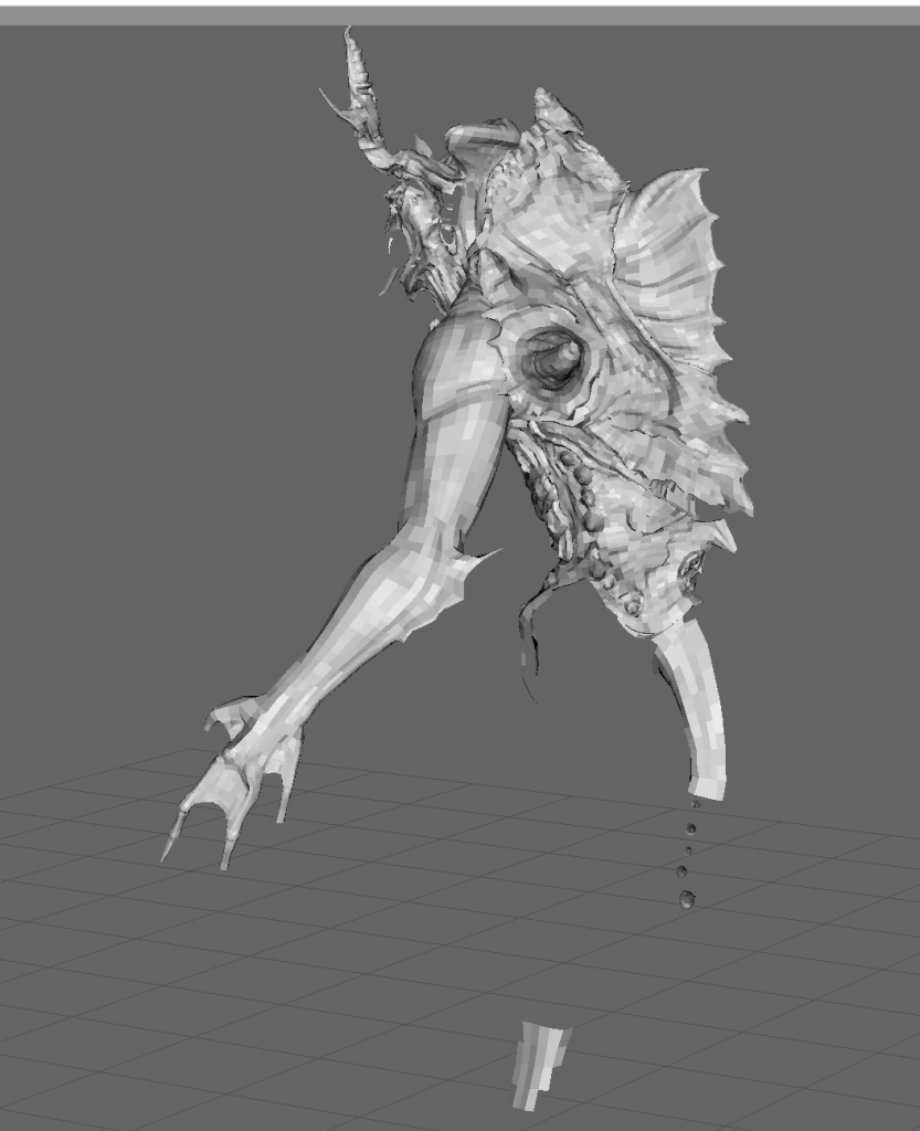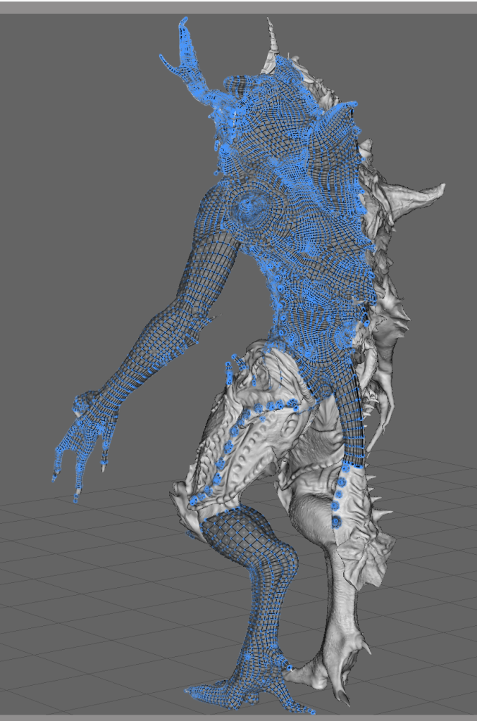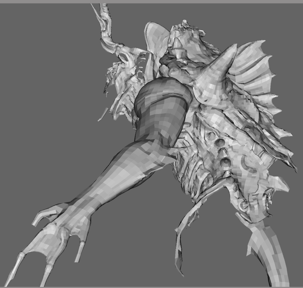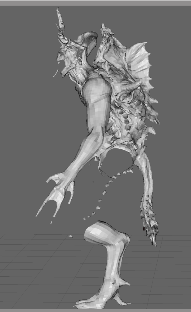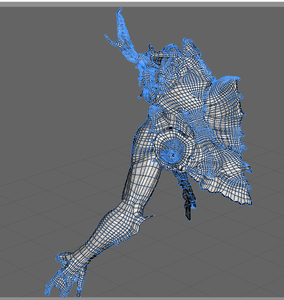 I started with the head, retopologising the face and horns, the crest and leaving the mouth until last and slowly working onto the traps and inside of the shell. Once these where done, I moved onto retopologising the front of the torso (briefly) and then began the deltoid and arm. I knew from watching tutorials and listening to my friend to follow the flow of the character, using retopology reference from the internet to aid my work, adding more loops in areas which would heavily deform and thereby limiting the number of triangles I use.