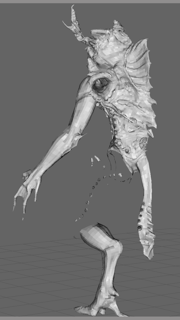 It can be seen in the images above the contionous and rugged development the head undertook. As I worked on this creature, I was continously thinking of different ways I could try to make the character more unfriendly and vicious. In the image marked phase 1, I believed that at this stage the head was too passive looking, not aggressive enough, so I began by adding more features to the character like in phase 2. I from there began the body, however part way through the sculpt of teh body, I changed my mind and decided it now looked too alien, I wanted something more bestial. I began by adding a mouth, large teeth and a long tongue, this seemed intantly to add more ‘threat’ to the head, however I was still unsatified and so I began adding spikes and horns to the frill, as well as more eyes and a plated appendage to the front, which can all be seen in phase 3.