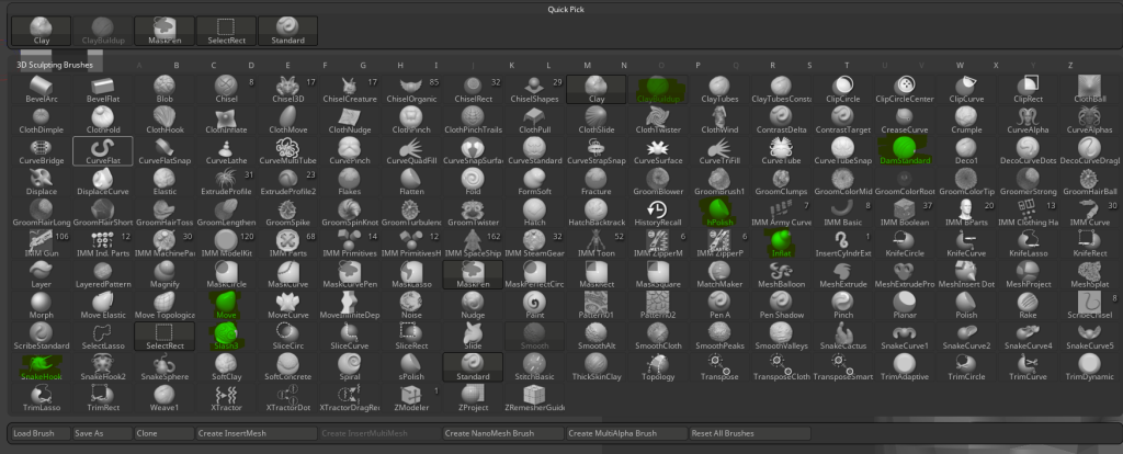 The brush tool is dynamic, but I mostly use it for quick selecting lots of verts by clicking the sleect option within the brush midifers tab. This allows the painting slection of vertices or edges. It can also be used to move verts about by selecting the move option and varying the size of the brush. Most of all, I use it for the relax option. like in Maya, this option relaxes quads and verts to conform them together so they are more equal. The keep border option stops the outer border of the mesh from being derformed or moved when using the brush or selection tool.