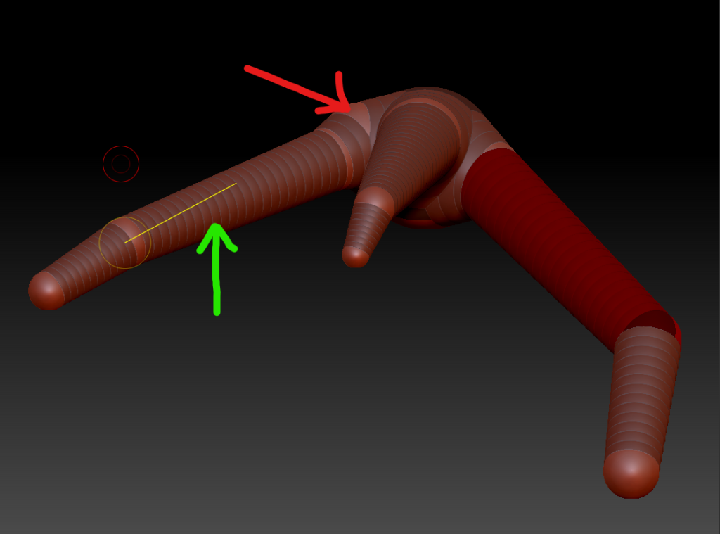 Zspheres are an efficent and easy way to quickly map out key form of a creature/character. They allow tubes to be created by manipulating the size of spheres and their positioning relative to one another. I used Zsphere in the inital mapping and creation of the arms, hands, fingers, legs and toes. Each ball acts like a knuckle or joint, by pressing ctrl once one has been drawn allows you to extend the ball into a tube, pressing ctrl again allows you to draw with the spheres. Once happy with the shape, you press ”A” to preview the sphres as a mesh, if everything is fine, you then convert it to a polymesh3D.