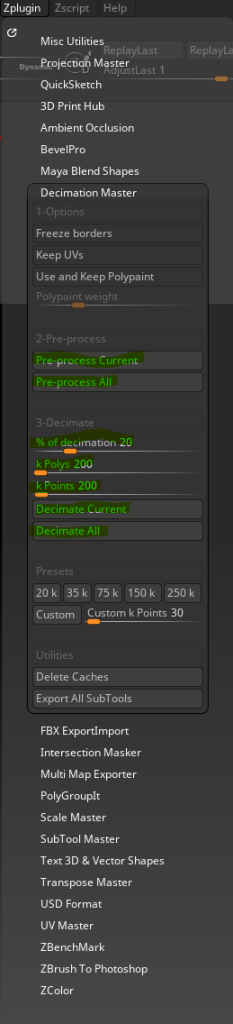 The buttons in green in the image above show the tools necessary for decimating a model. First, the model is merged together (if needed) and then it has to be pre processed (a step necessary before every decimation). Depending on what you want to process, either the entire model or the current selection in the subtool menu will depend on which option is chosen. Once the model has been pre-processed, the percentage of decimation can be chosen, allowing a target count of polys to be achieved after the decimation. I first chose to go for 1 million, to vet how much detail it would retain, once it was decimated, I decided it could be even lower, achieving a count of 400 thousand polys before it started to loose too much detail. This count was in range with what many suggest a retopology count to be (depending on the level of detail to be captured).