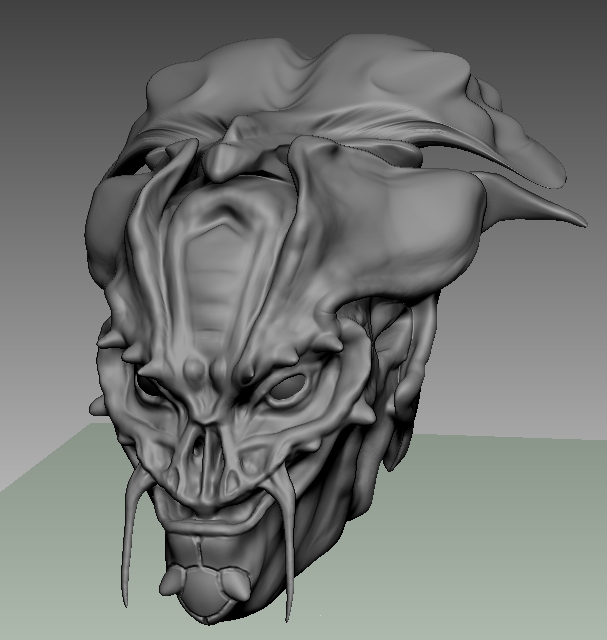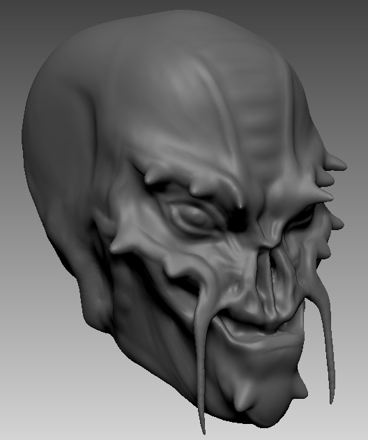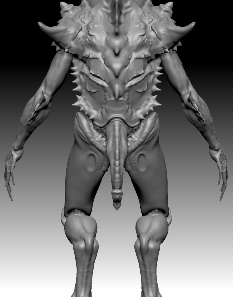 Ths most common brushes which I ended up using from his suggestions where the standard brush; excellent at adding quick shape and build-up of the material. The Clay Buildup tool is one of the best tools for building up additional shape but best of all, when used lightly and consistently in the same driection, can even give you ‘free detail’ from the strokes and stryations it tends to make in the clay. The Dam standard tool is excellent at cutting into the clay to create trenches and harsh creases. When used lightly (by dropping the intensity) it can also be used to define detail in areas, such as mapping out muscles and tendons. The inflate brush was mainly used for areas such as fingers, where the mesh can become a little thin and require a little thicknening out. Mainly however, I used it mostly to repair glitches/holes in the mesh, by inflating the holes first then dyna-meshing the model, it helps close these awkward holes. The move tool is extremely important and once again, should really be used with the inetnstiy turned down, this way the tool can be used to nudge and ease certain areas of the model around, allowing quick editing and anatomy tweaking, I used this brush frequently, mainly for positioning certain things such as spikes and fingers, arms, jaw placement, eye placement, the tool is dynamic and very useful overall. Hpolish is a tool which requires a little bit of experimentation and practice since using it can be quite tricky to achieve the sort of polished edge you require. The user must make sure the orientation of the brush matches the direction you would like the brush to flatten/polish off. I used this later after much practice and I mainly used it to polish off the shell areas of the creature to add a nice solid carapace look, like that of a turtle. Slash3 is very similar to dam standard, however, it is very aggressive and carves right into the model, its good for quick/deep trenches and holes. The snake hook is basically a free spike tool. The user grabs the area they want to stretch and pull in the direction they would like it to go. This, like the Hpolish brush can be tricky to use and requires a bit of practice. I used this brush for pulling out the inital base of the teeth, the horns, spikes, tongue, anything that protruded.