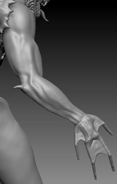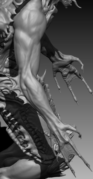 Sculpting the legs was done using zspheres as an initial base, then slowly building up the form and shape of the calve muscles and tendons that are typical in this sort of leg design, using the clay buildup brush. I used a dinosaurs leg as inital reference then added more girth and muscle to accomodate them holding up such a big creature. This was a lesson taught to me by my friend, to think about the design of a creature, if its muscular, big and strong, it would be heavy, therefore it would not have small leg muscles; if teeth and claws are long and thin, how are they functional? They would realistaclly snap! Using this idea of thinking about the realism of anatomy, catapulted the design forward immensely, making the overall design look far more real and feasable. I used my anatomy model to carefully sculpt in the muscles and tendons along the arms and legs, paying heavy attention to arm muscles and the deltoid area. From here i now had a muscular humanoid form that I could build on top of to create something more creature-like.