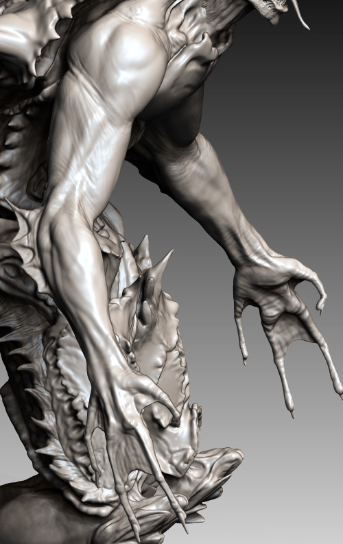 As can be seen in the photos above, the arms and shoulder plates underwent some re-designing, as well as the addition of some fins, webbing and the removal of the forearm plates. In the end, i opted to remove these armour plates from the shoulders and forearms completely, as I believed the design began again to stray from the original idea. It also gave me an opportunity to showcase detailed arm anatomy and practice it.