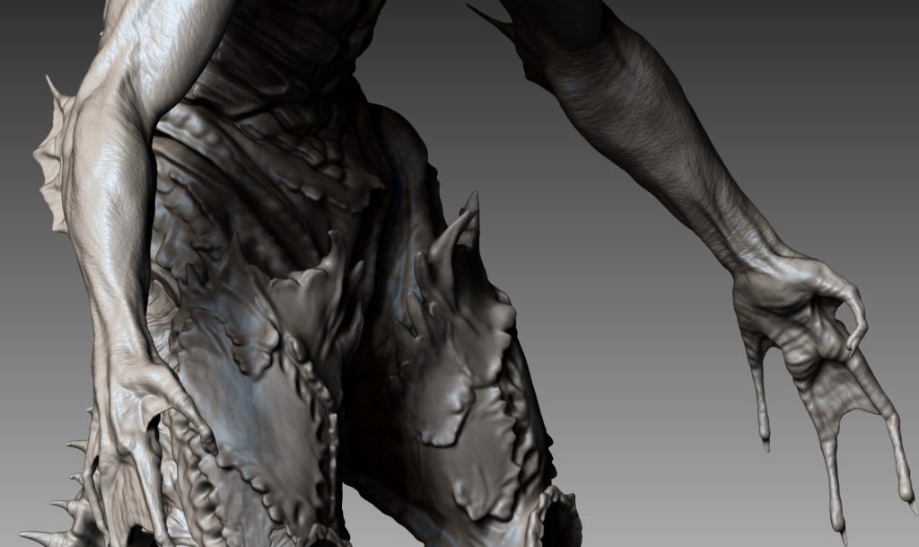 When it came to sculpting the torso, I began by pulling out the basic shape and sculpting it naturally. However after a while of sculpting and a bit of guidance from my friend, I removed these changes and decided to use Zspheres, as they made it easier to create the posture I was looking for, a hunched over position. This way with Zspheres I had complete control on the length, width and posture of the overall body. Even after the body was made with Zspheres, the move tool was necessary to pull some of the form into position – like width of the forearms – the shoulder positioning and the girth of the stomach and waistline.