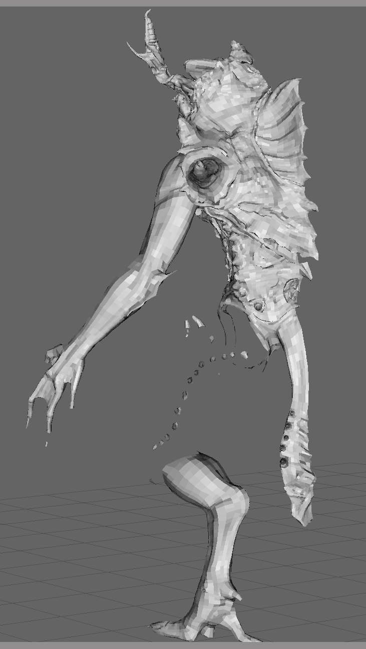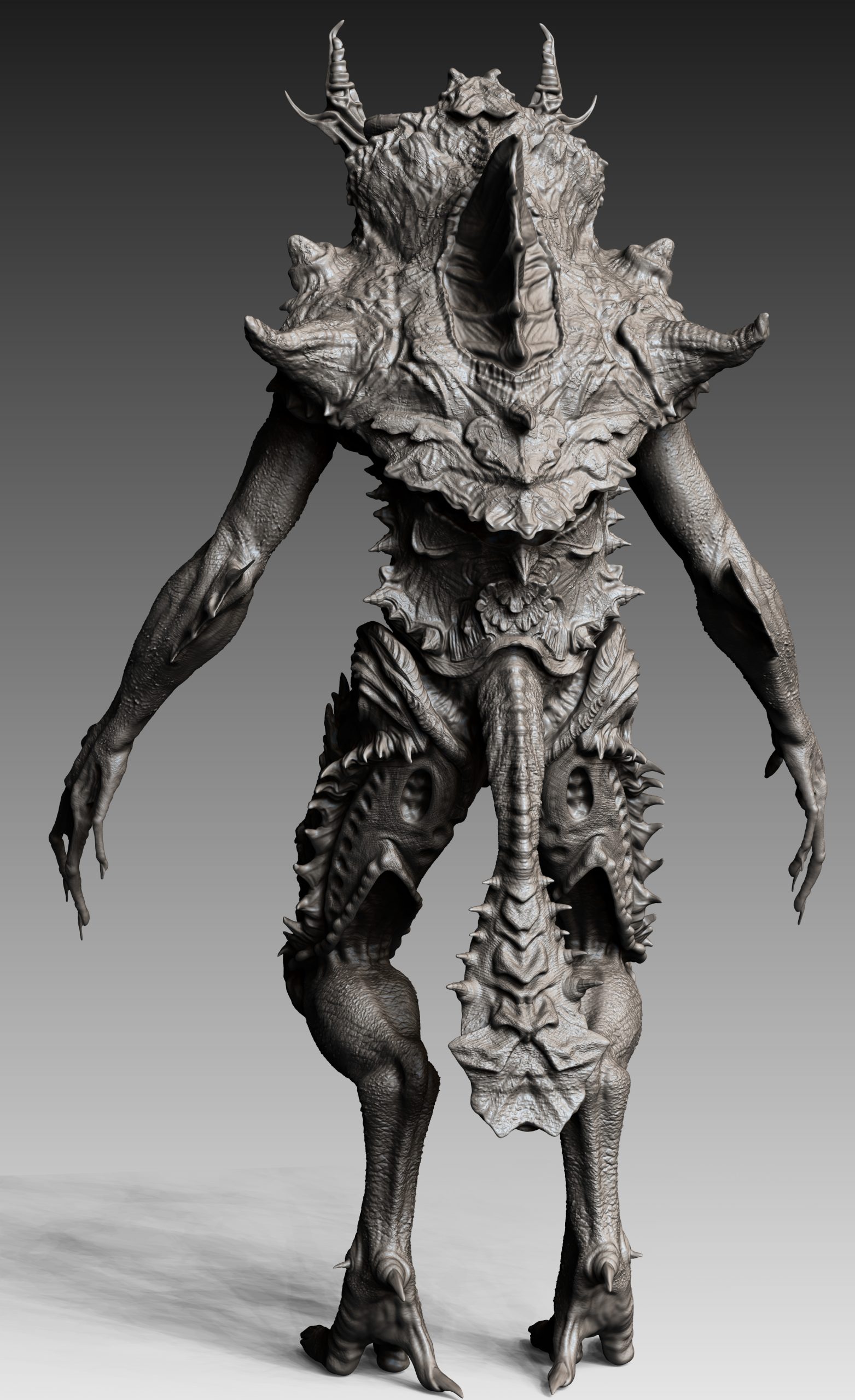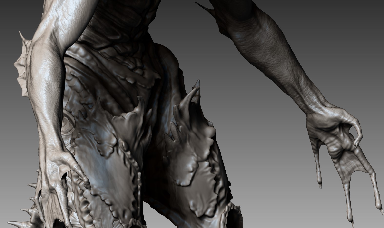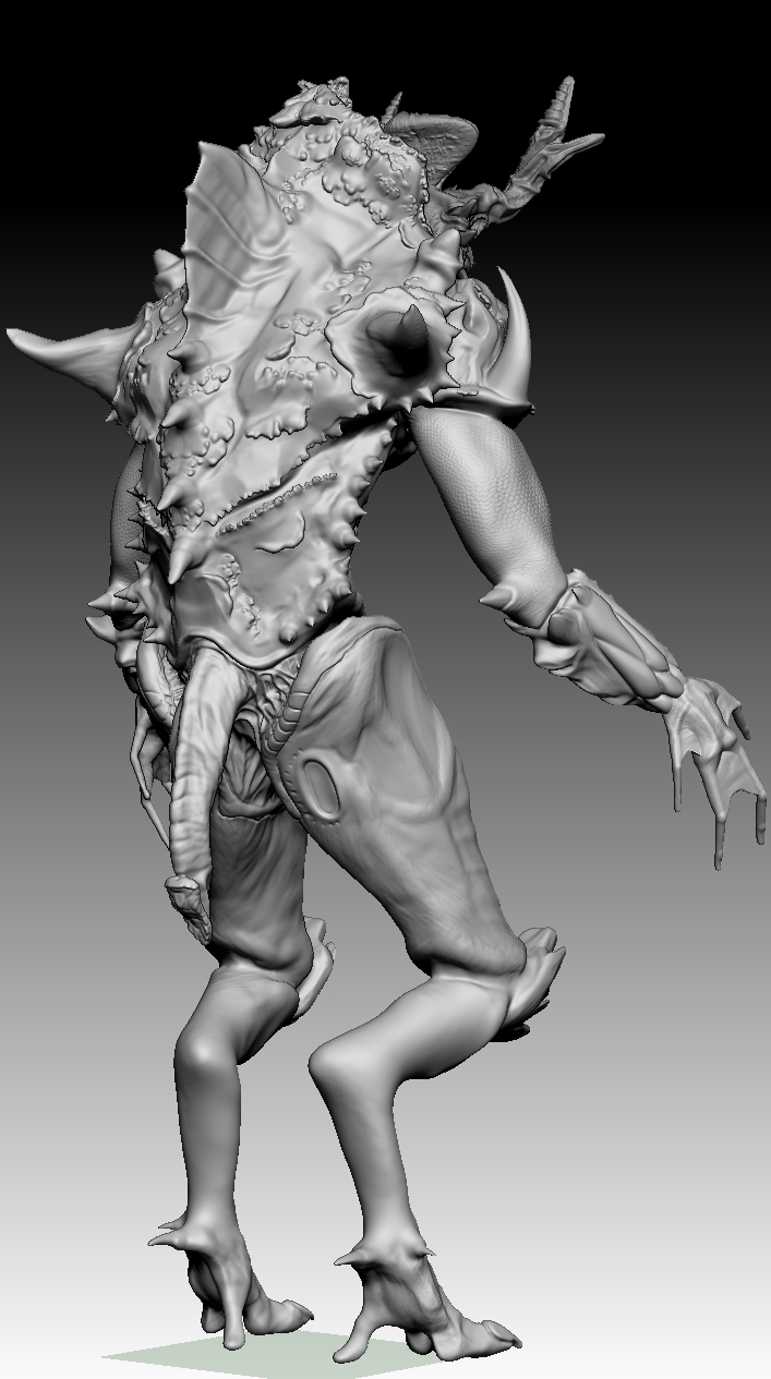 Working with Zbrush was incredibly fun and such an explorative journey. Previous to this sculpt, I only had minor knowledge with the program and hadn’t much experience sculpting something to this degree. My previous knowledge within Zbrush was limited to working with small details, such as adding engraving to hard surface models like weapons, sculpting an organic creature, that had to be anatomically correct was a whole new challenge. However, I had some help and a lot of guidance from a friend, who has sculpted for over eight years, and is a professional within the industry already. From his knowledge and guidance I quickly grew, learning the basics of anatomy and the principles of designing creatures. Most of all, Luke (professional) demonstrated how fancy brushes and exspensive IMM brushes are not necessary in the creation of a high qaulity creature, that most of any detail and shape can be achieved with the standard brushes ZBrush has to offer.