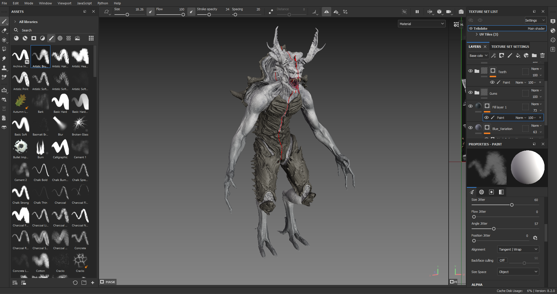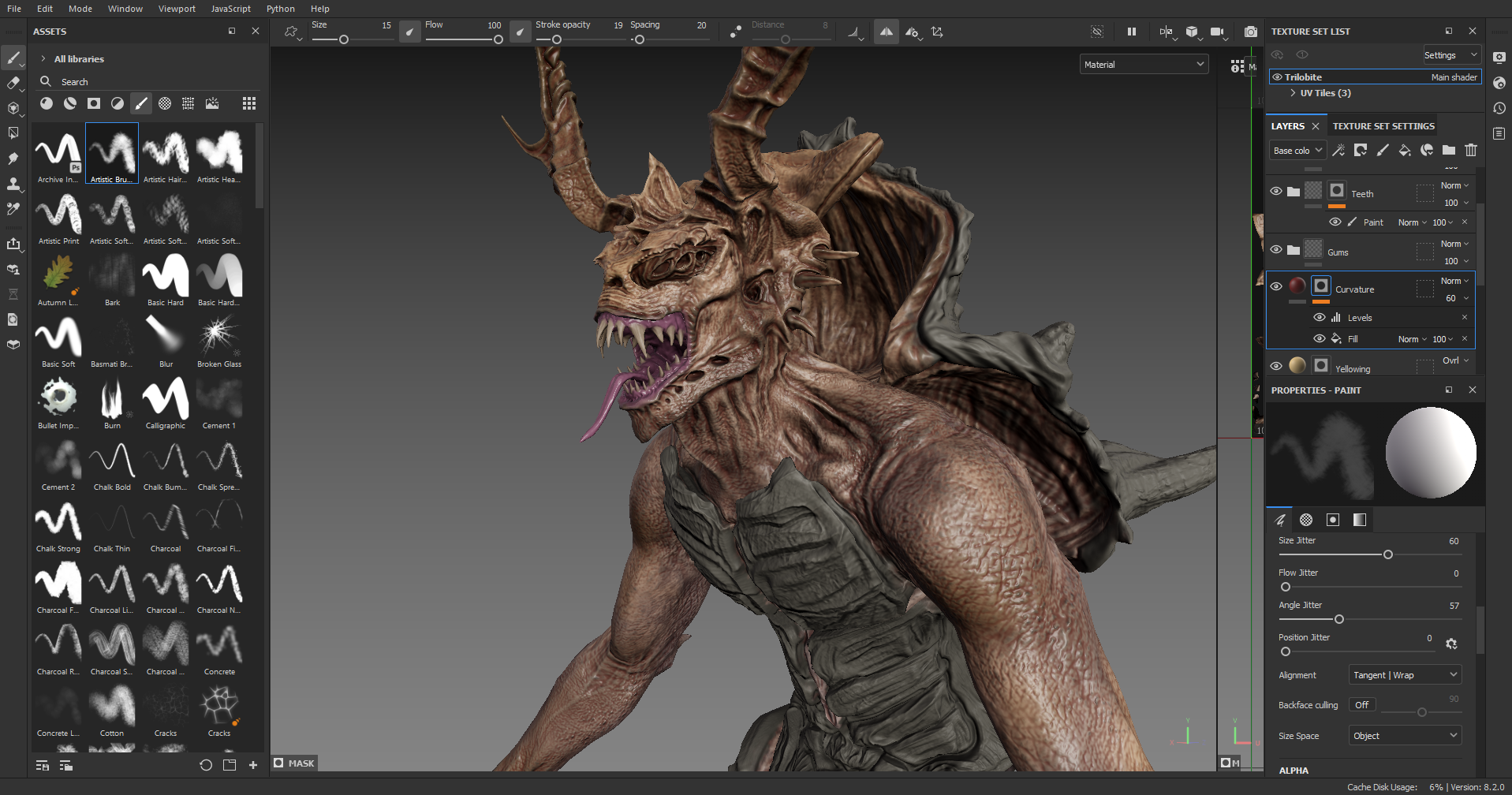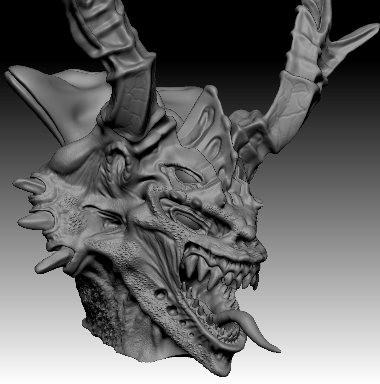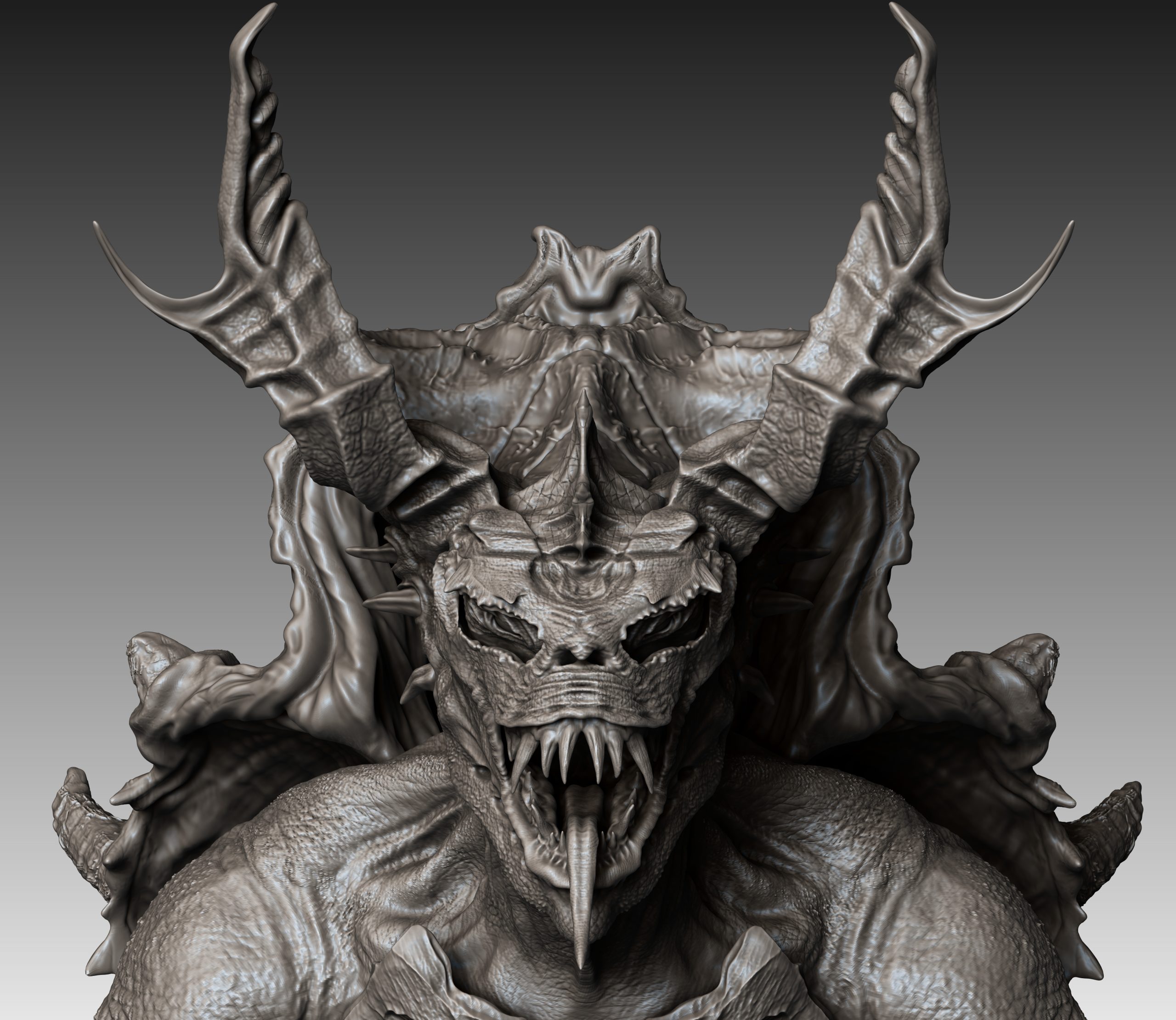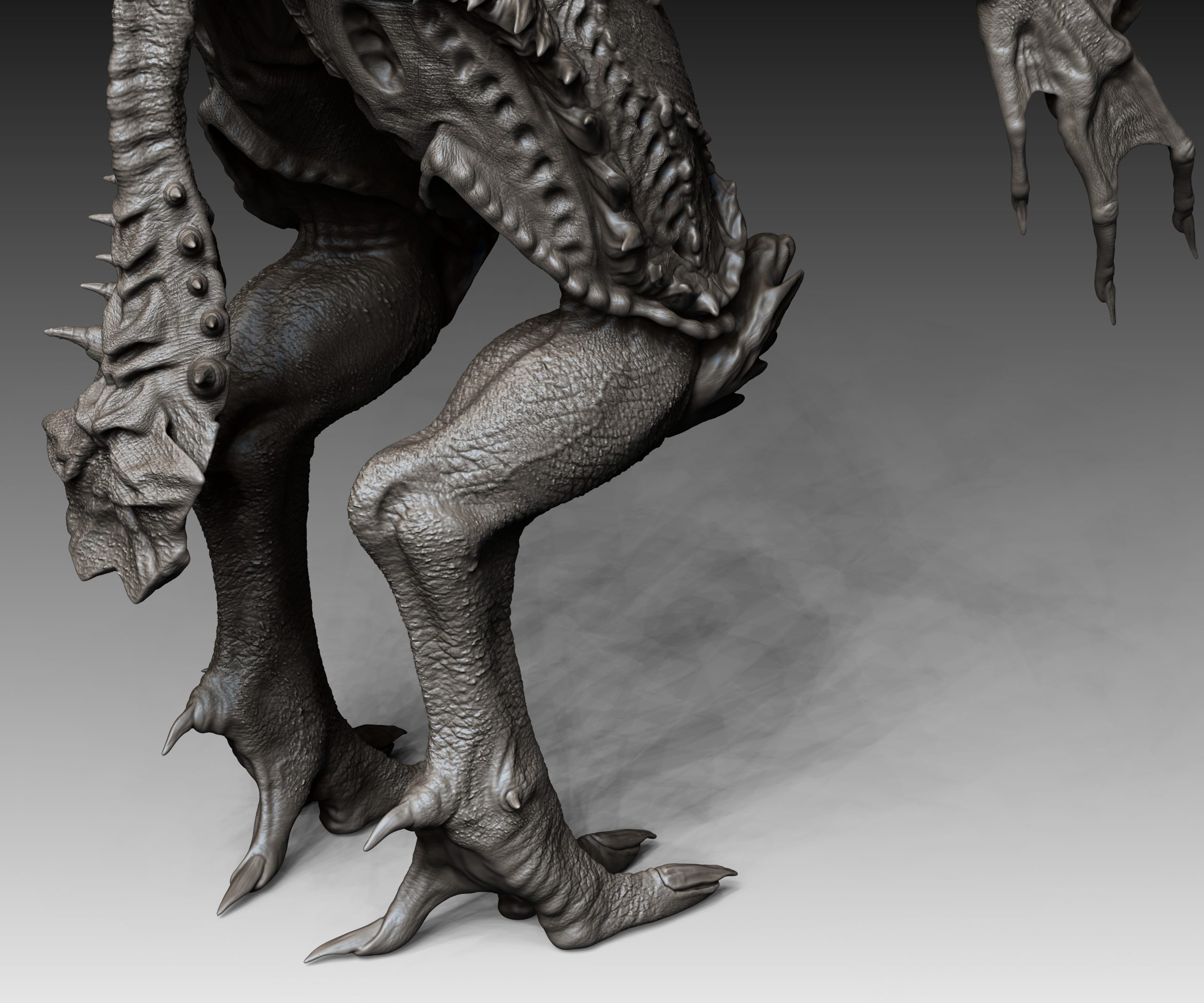 Once the model was somewhat complete, I began the first detail pass. This is the stage where once all the shapes and details are in place, you begin adding the finer details such as refining muscles and tendons, building up the spikes, adding more detail to mouth and teeth. This first pass starts to add more realism to the model (if thats what you want.)