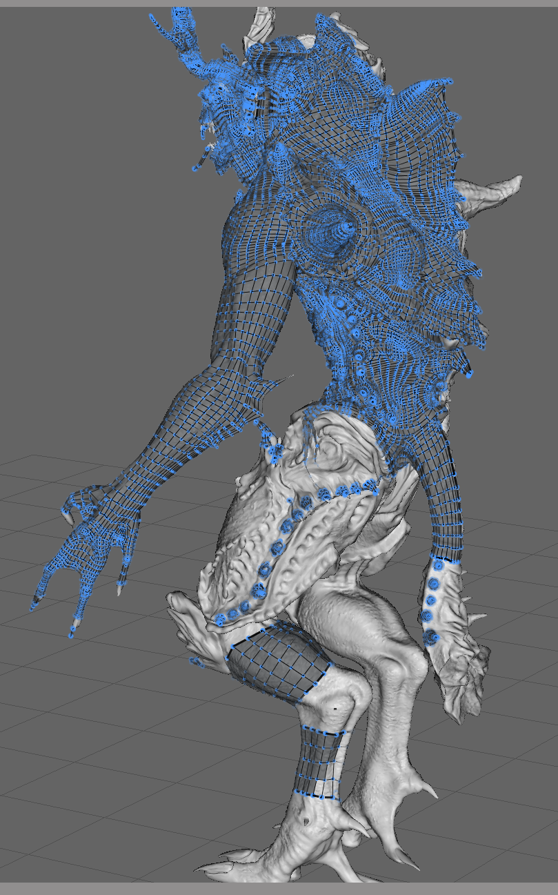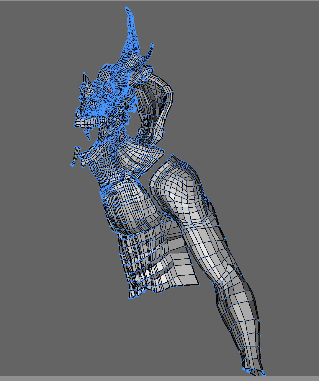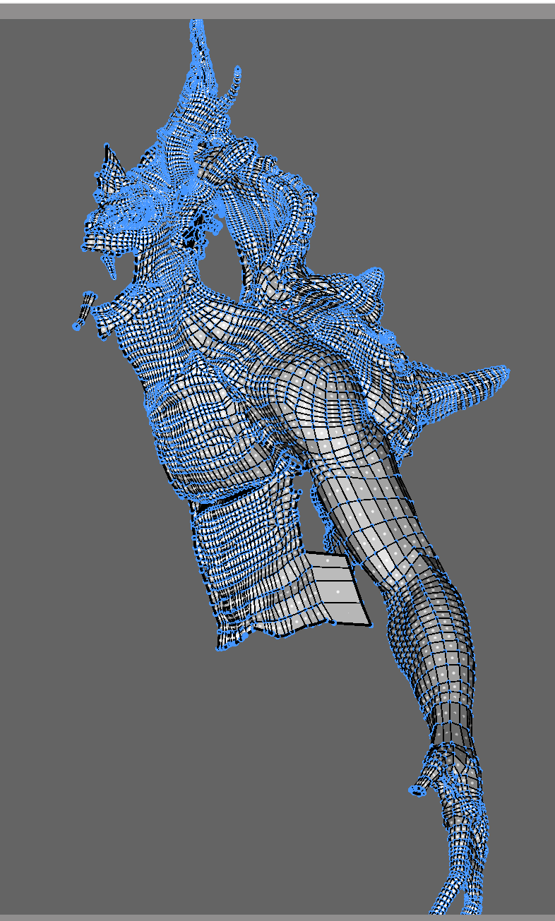 With the lower half now complete and the tail, the last major part to retopologise was the thigh and knee bones. I left this till last so I could pick up some skill along the way, as I felt this was going to be hard, due to the many spikes and plane changes of the design. I started it by mapping out the thigh and completing the space between the thigh and calve, as the area between the thigh and knee bone would be deforming heavily in the future. I wanted to make sure the loops in between where neat and plentiful so animation was easier as well as the uv stage.