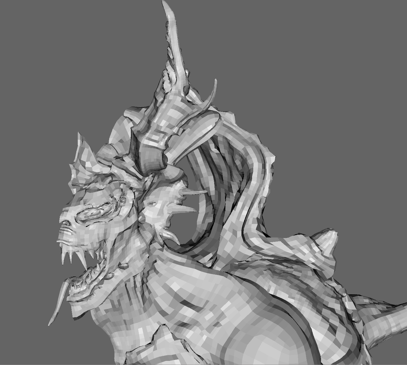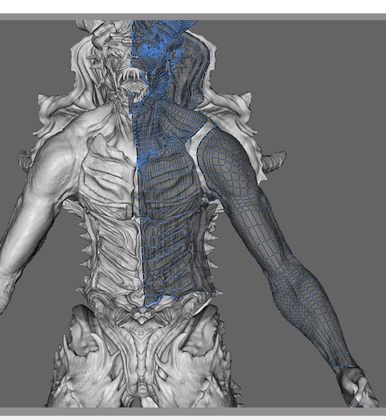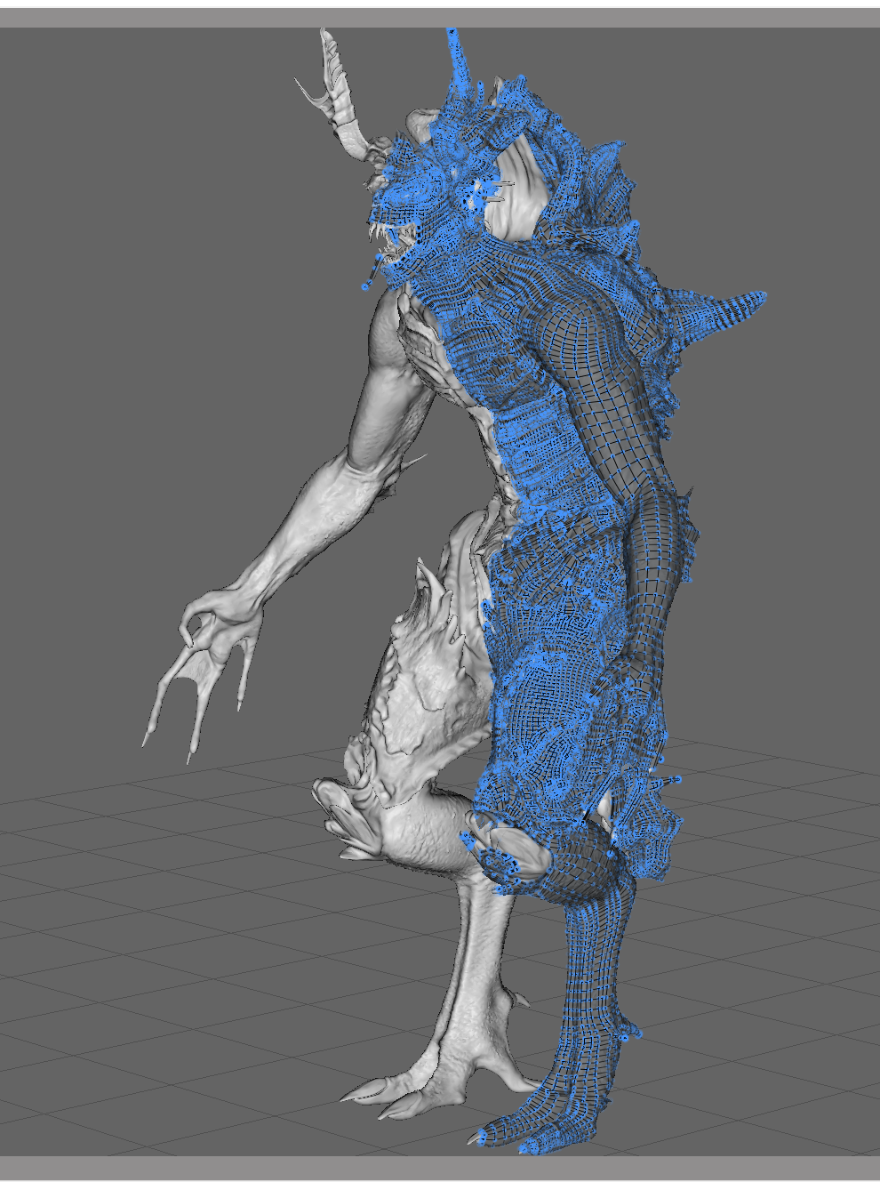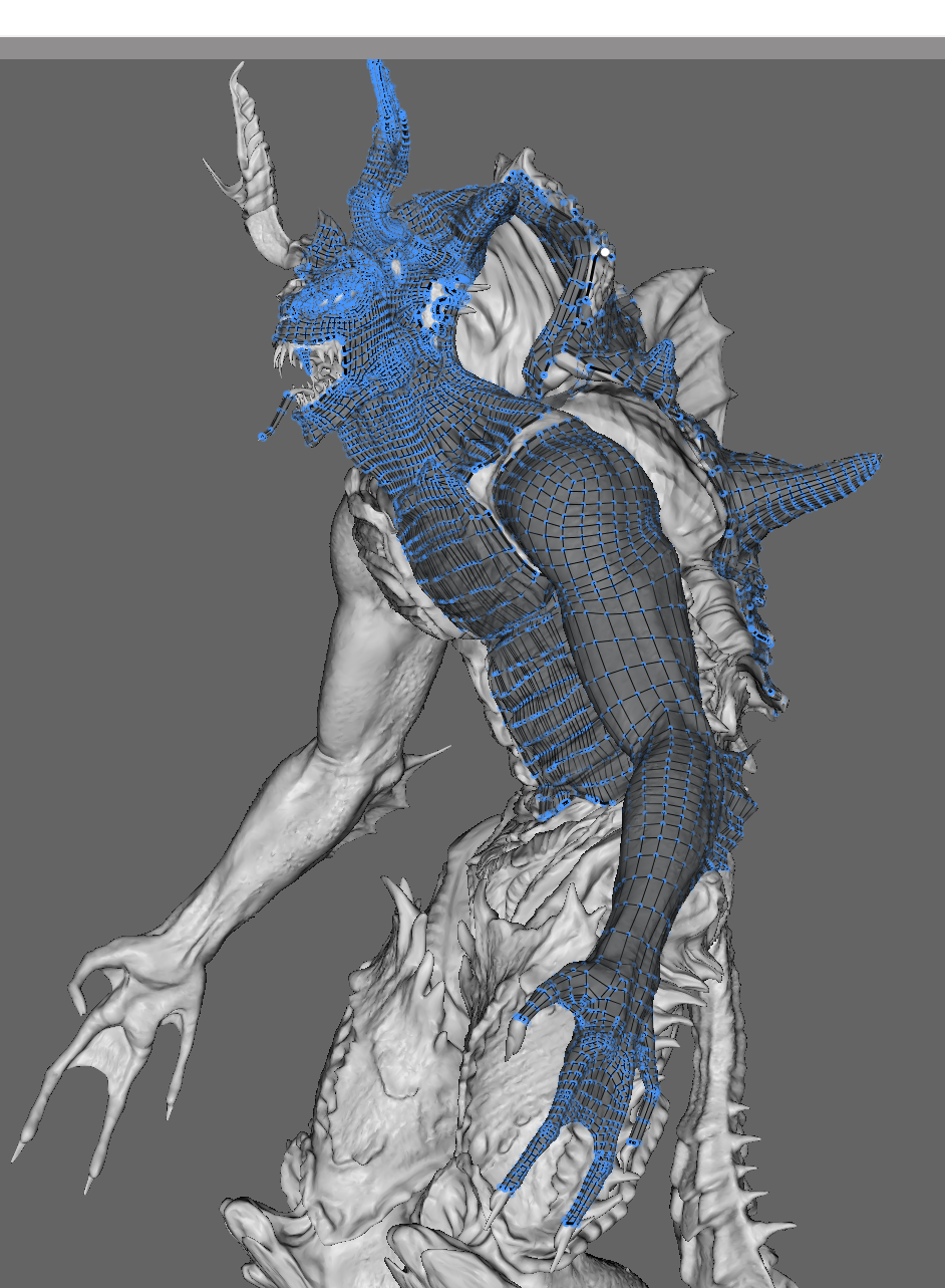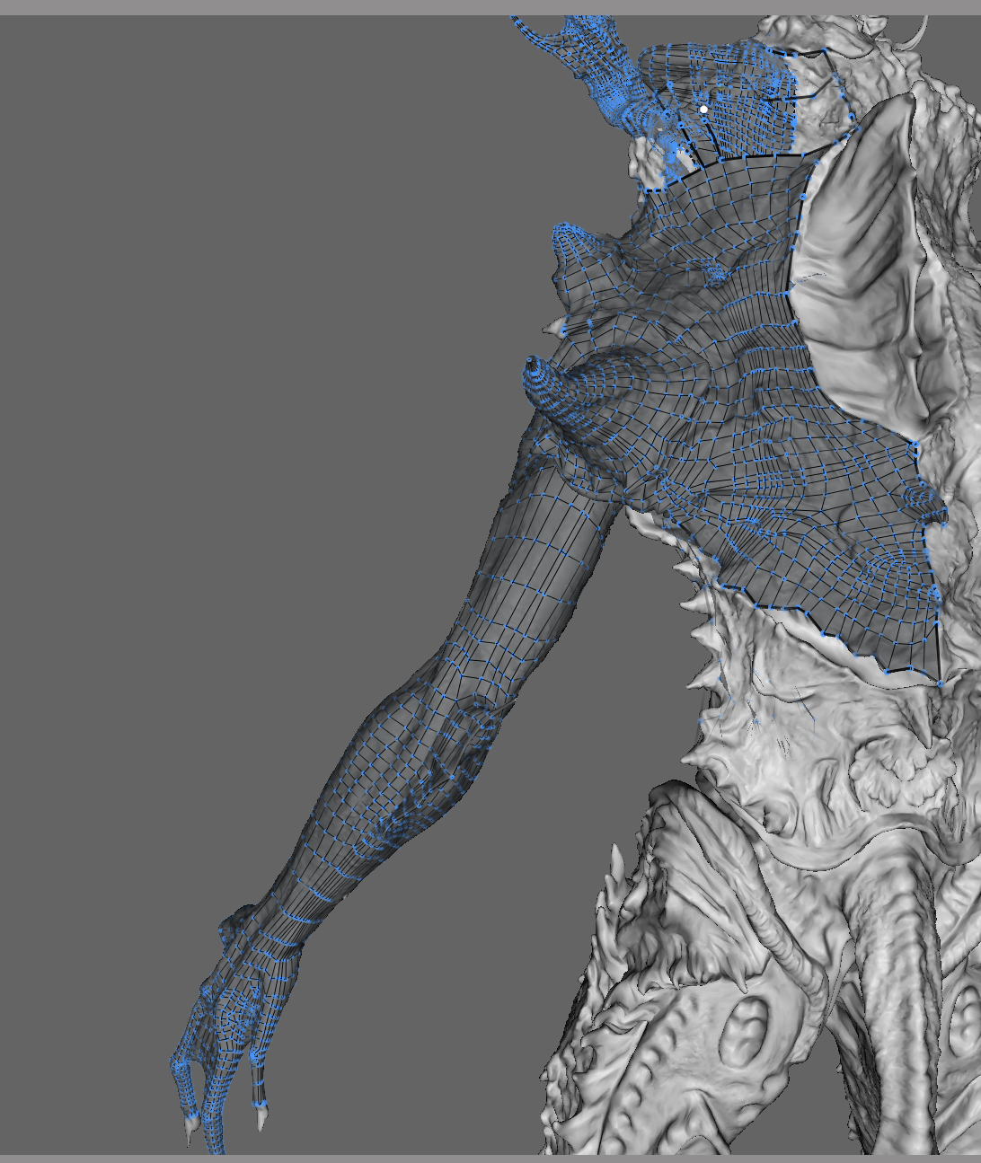 I started with the head, retopologising the face and horns, the crest and leaving the mouth until last and slowly working onto the traps and inside of the shell. Once these where done, I moved onto retopologising the front of the torso (briefly) and then began the deltoid and arm. I knew from watching tutorials and listening to my friend to follow the flow of the character, using retopology reference from the internet to aid my work, adding more loops in areas which would heavily deform and thereby limiting the number of triangles I use.
