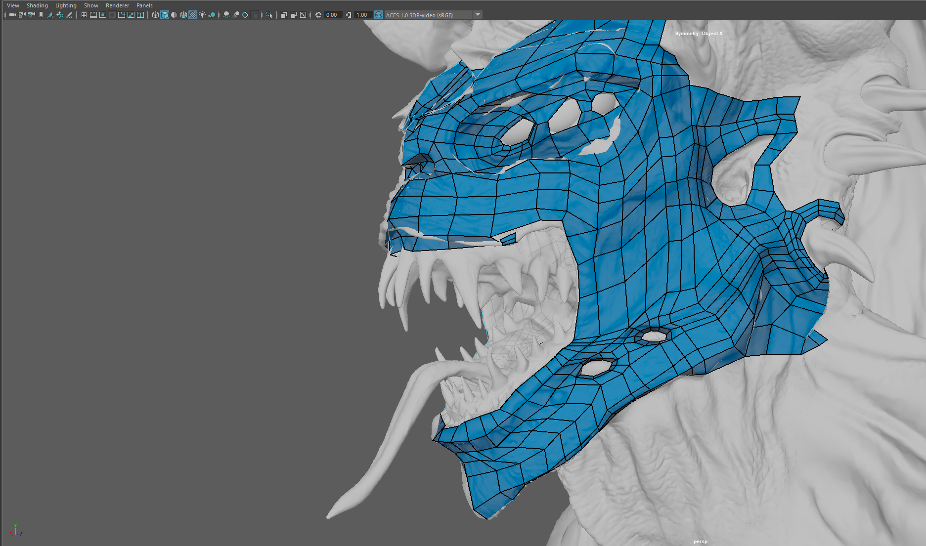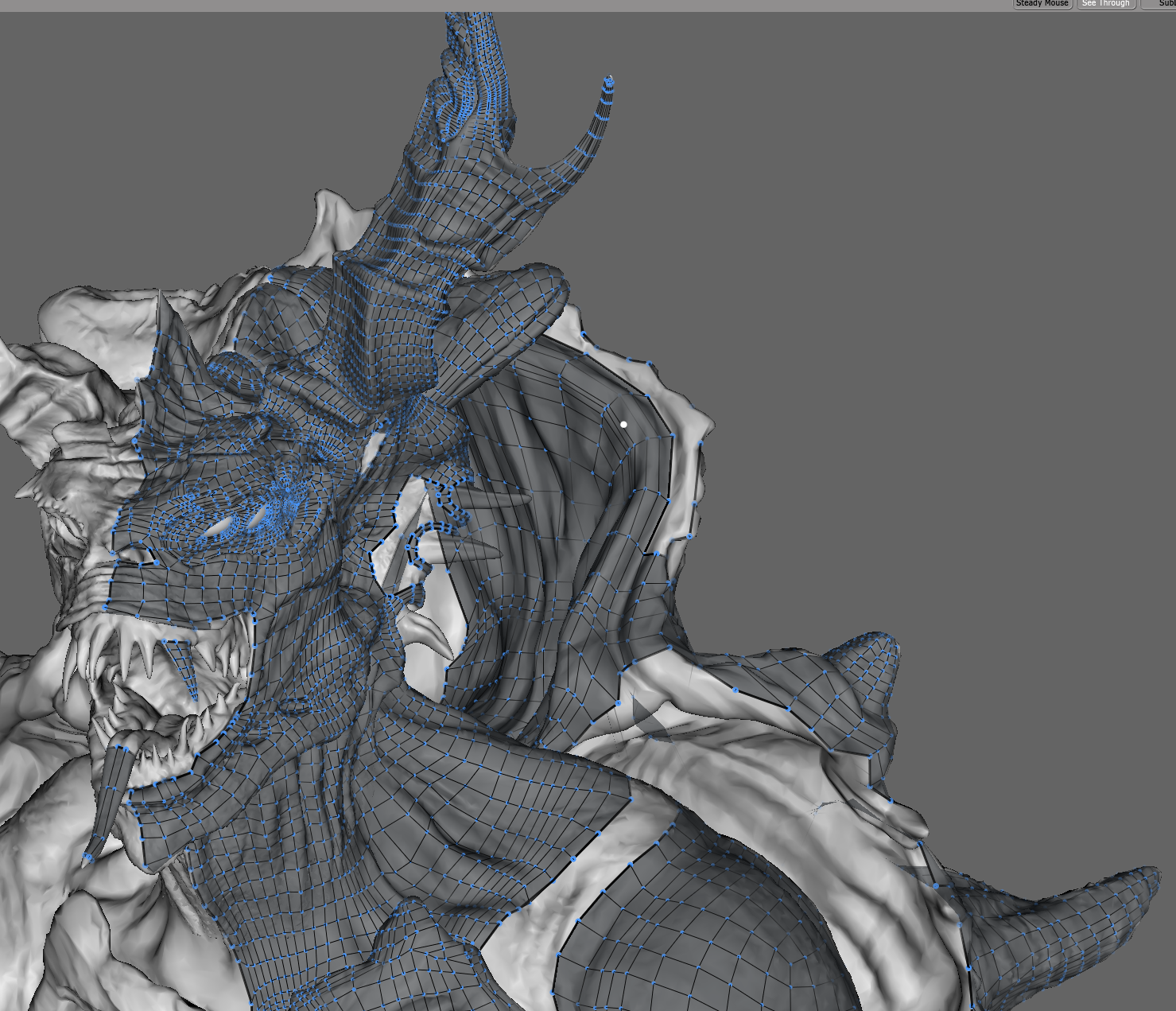 Now i had a decimated model at a manageable poly count, I began the retopology stage. I first started the retopology in Maya, however, once I reached a certain point (see image), the program became slow and unresponsive and was therefore not viable.