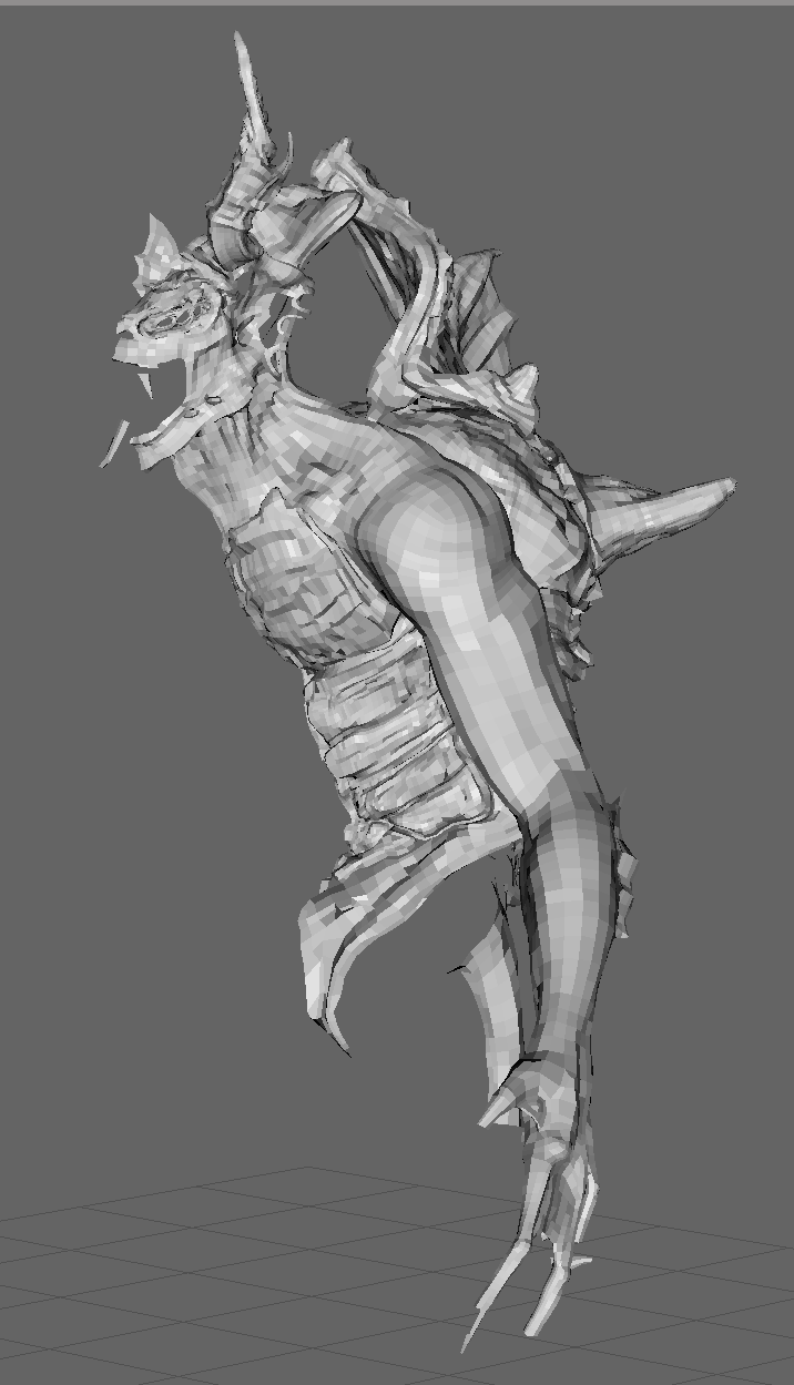 Once the upper half was done, I started the lower half, completing that and moving onto the base of the tail and lower torso. From here I took some time to define the torso quads a little more, relaxing them and adding more loops and filling in the gaps between the shell and the torso.