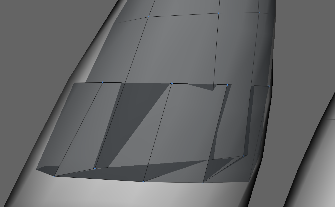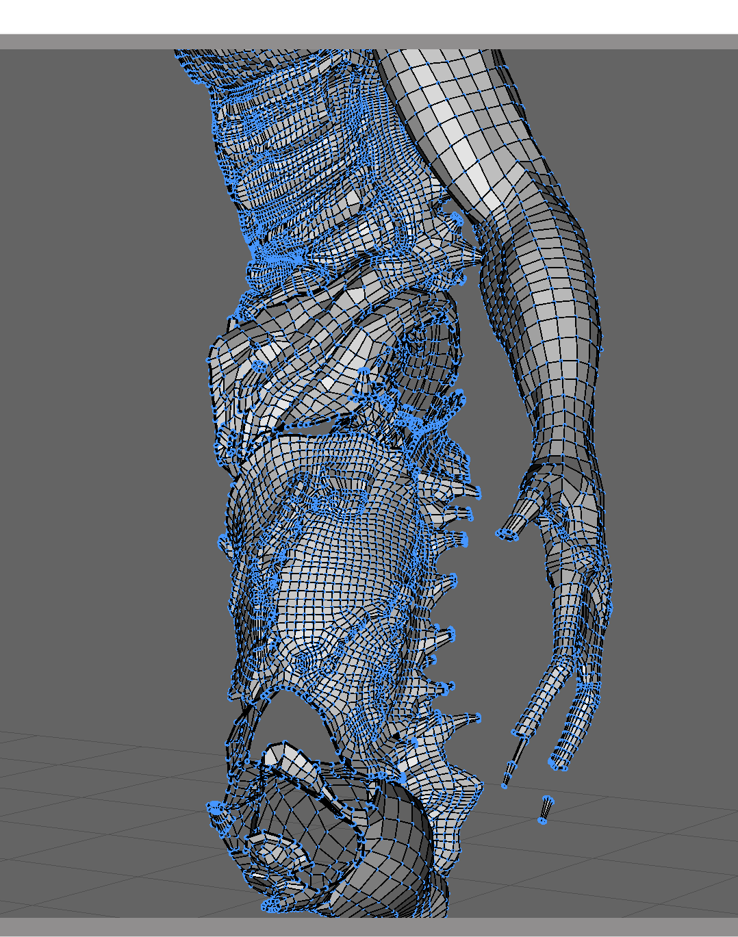 Once the arm was done, I moved onto the hand and rear of the shell. The shell was an enormous task, I broke this into 3 sections: the upper shell, the lower shell and the gap in between them, doing them seperately then joining them together later. The first thing I always completed when starting a new area was ring and loop any spikes, as this just makes joining them up to the flat transitions easier.