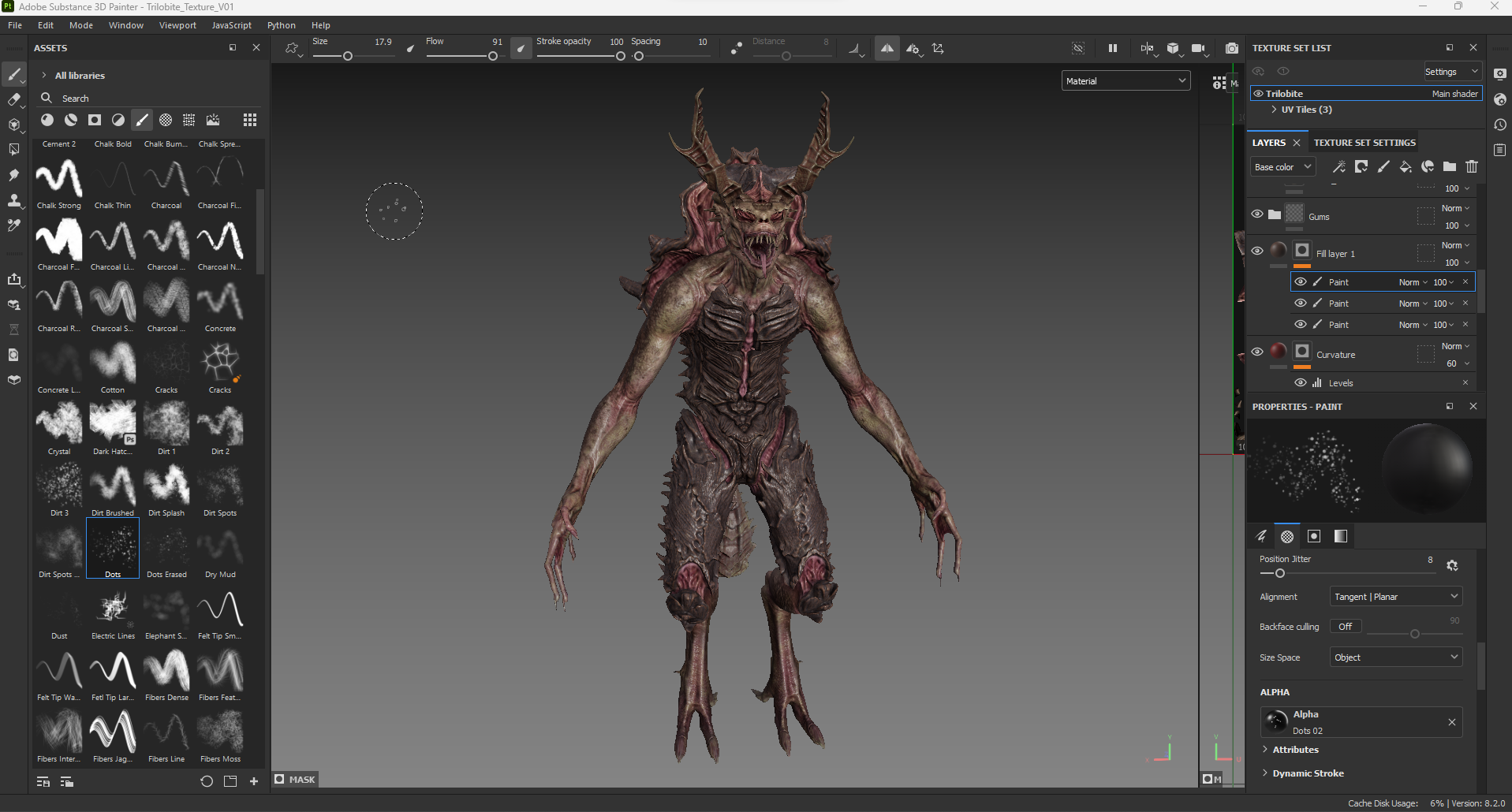 Again I began by breaking up the areas. Uv’ing each part individually and breaking them away one by one. I started with the spikes, teeth and horns, ringing these and splitting them down the back. Once these where done, I began with the head, leaving the mouth. I then broke off the arms and hands, splitting the hands down the center edge and splitting away the elbow fins. Next, I broke away the shell from the back, spltting this down the centre and following suit with the torso. The legs where then broke away at the hip joints and split at the calf, the calf was then split from the foot at the ankle. These where then unwrapped individually and split down the inside. The tongue was then broke away from the mouth and the mouth unwrapped leaving the model now complete. I packed the Uv’s into 3 UDIM’s to preserve some resoloution, saved them and exported them into substance painter to begin the texturing process and finalise the project.