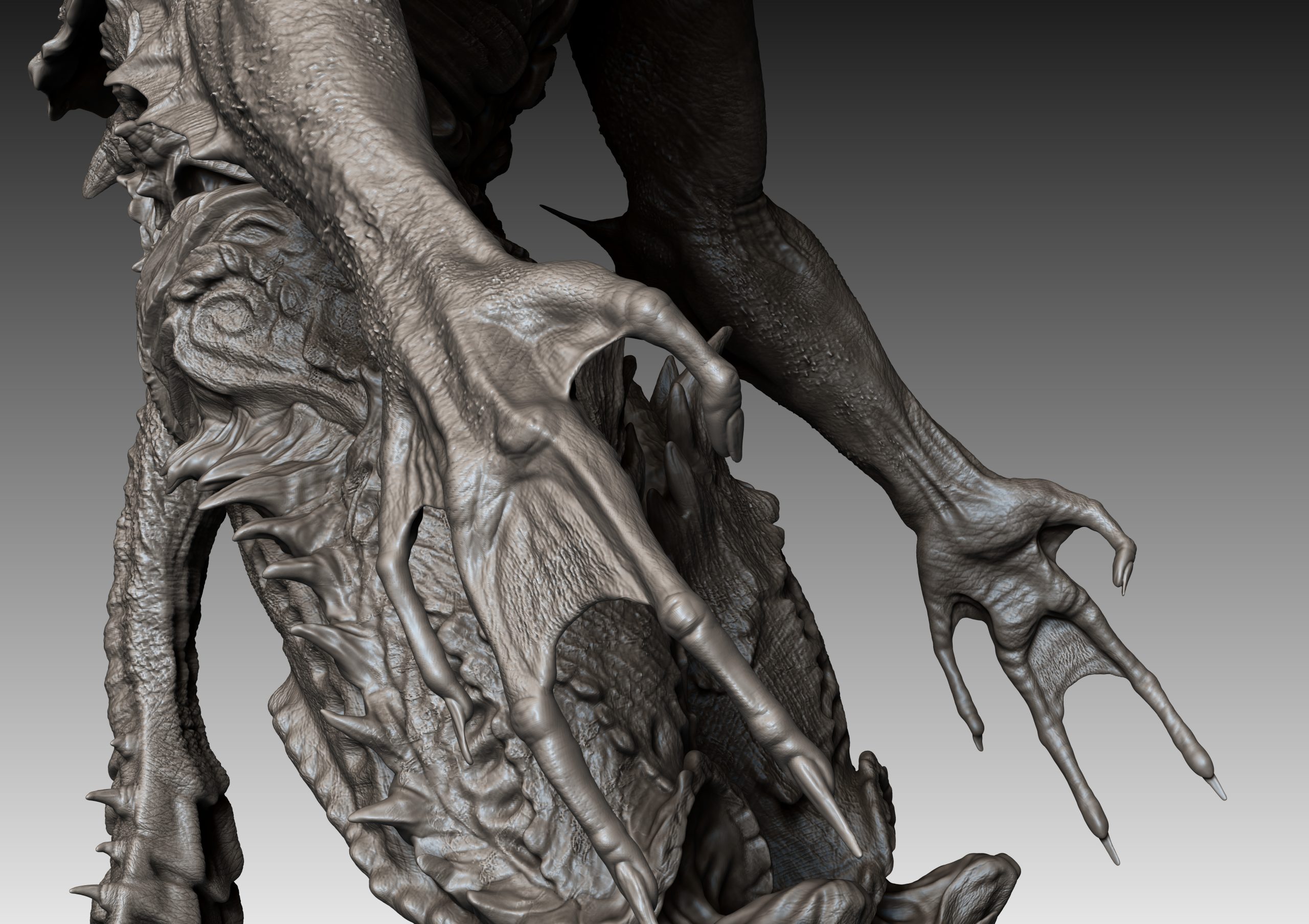 Sculpting the legs was done using zspheres as an initial base, then slowly building up the form and shape of the calve muscles and tendons that are typical in this sort of leg design, using the clay buildup brush. I used a dinosaurs leg as inital reference then added more girth and muscle to accomodate them holding up such a big creature. This was a lesson taught to me by my friend, to think about the design of a creature, if its muscular, big and strong, it would be heavy, therefore it would not have small leg muscles; if teeth and claws are long and thin, how are they functional? They would realistaclly snap! Using this idea of thinking about the realism of anatomy, catapulted the design forward immensely, making the overall design look far more real and feasable. I used my anatomy model to carefully sculpt in the muscles and tendons along the arms and legs, paying heavy attention to arm muscles and the deltoid area. From here i now had a muscular humanoid form that I could build on top of to create something more creature-like.