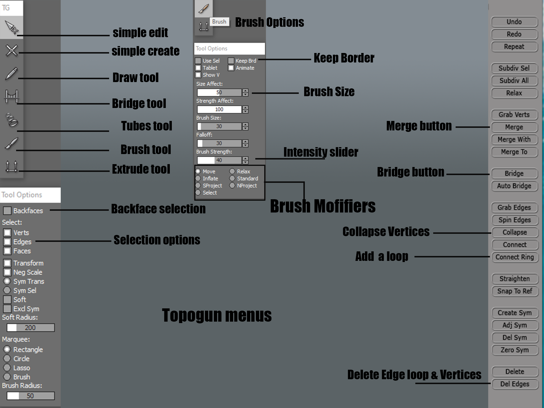The brush tool is dynamic, but I mostly use it for quick selecting lots of verts by clicking the sleect option within the brush midifers tab. This allows the painting slection of vertices or edges. It can also be used to move verts about by selecting the move option and varying the size of the brush. Most of all, I use it for the relax option. like in Maya, this option relaxes quads and verts to conform them together so they are more equal. The keep border option stops the outer border of the mesh from being derformed or moved when using the brush or selection tool.